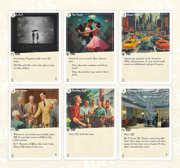 For the employee cards, the tones are more yellowish and warmer; the colors are a bit more intense. There are frozen, impersonal smiles in a way that only GenAI could do—like feigned happiness. The game mechanics also try to reflect this imposed glee and the consumerist spirit of the era. But there are also more real images of the more "feely" type associated with the human condition. It all ties together both loosely enough to leave room for interpretation and tightly enough to make thematic sense when you play the game. The devil is in the details, but I don't want to spoil the fun of discovering them.