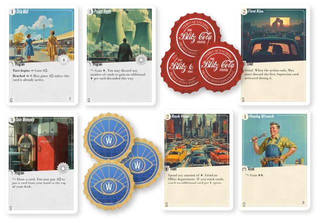 Set in a nostalgic 1950s American Dream with dystopian undertones, traverse a world full of corporate intrigues, class struggles and moral dilemas; all sprinkled up with a good dose of retro vibes!