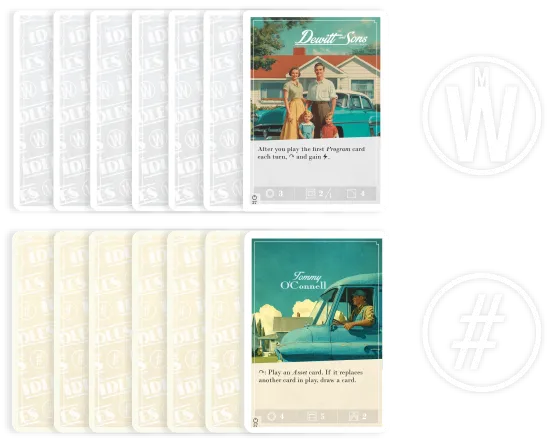 The Idles is an asymmetric card game for two players. Set in a nostalgic 1950s America with dystopian undertones, the game pits a mysterious supercomputer—obsessed with maximizing corporate productivity—against a lowly employee struggling under that very weight.